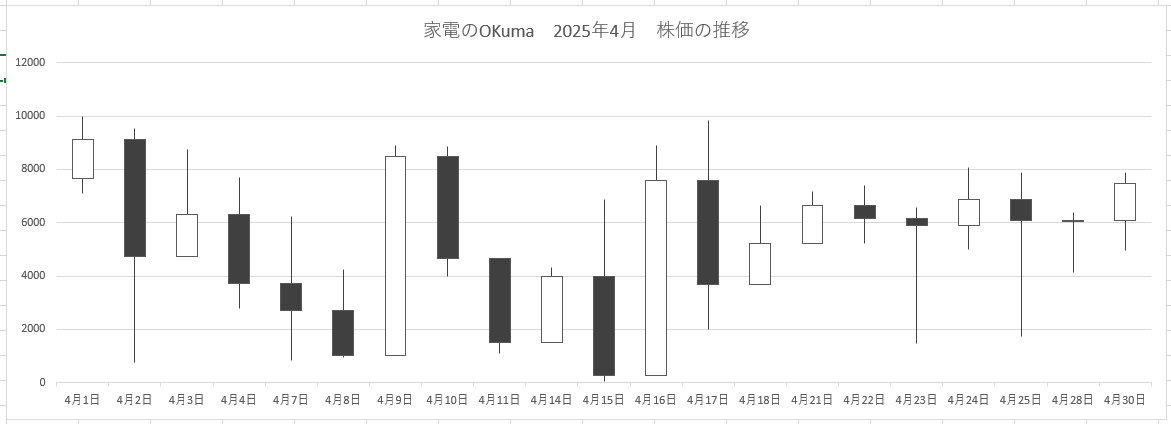 株価チャートグラフ こんにちは。スタッフ奥間です。今日は「株価チャートグラフ」についてお話します。 皆さんは、Excelで株価のグラフを作ったことはありますか?検定では全く出ませんが、どのようになるのか見てみましょう。 作成するにあたって、ルールがあります。それは特定の項目順に並べないといけない所です。今回は日経で目にすることがある始値-高値-安値-終値でやります。今回は、架空の家電量販店の今年4月の株価です。 このようにチャートが完成しました。 皆さんも、株価をグラフにしてはいかがでしょうか。 2025年7月7日 appdu