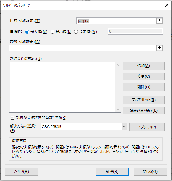 ソルバーって何?という方に説明しますと、簡単に言えば「目標の数値にするために複数の条件に合う複数の変数を入れる」ことです。